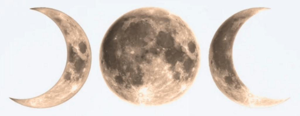 Le symbole de la triple Déesse c’est tout simplement une lune pleine encadrée de, à sa gauche la lune croissante et, à sa droite la lune décroissante… il faut savoir que la Déesse est aussi appelé Déesse lune… la Déesse (lune) est éternellement jeune et elle a en même temps le vécu d’une personne âgée (la plus âgée avec le Dieu)… ce qui fait qu’elle est pétillante de vie, pleine de fraîcheur, comme une jeune femme, et elle est en même temps sage et aguérie, pleine d’expérience et confirmée comme une vieille femme… c’est pour ça qu’on l’a représente comme une lune bien pleine avec tous les avantages de la lune croissante, c’est-à-dire la jeune fille, et les avantages de la lune décroissante, c’est-à-dire la femme âgée… cependant la Déesse ne se présente jamais sous un aspect ou bien sous un autre, contrairement à ce que certaines personnes mal éclairées ont cru… elle n’est pas un coup la jeune femme, un coup la mère, un coup la femme âgée, mais elle est toujours la Déesse mère, pétillante de vie et sage à la fois… elle n’est qu’une et non pas triple contrairement à ce que l’appellation « triple Déesse » laisse suggérer… le symbole de la triple Déesse marque plutôt sa plénitude et son intemporalité ainsi que son éternité… elle a toujours été là et elle sera toujours là éternellement jeune et avec la sagesse immémoriale…